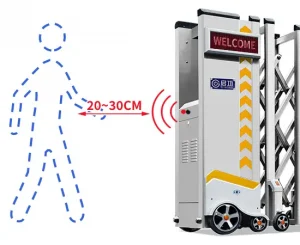 The automatic retractable gate features an intelligent infrared anti-collision sensor that detects people or objects 30–50 cm away during closing and automatically reverses. It also includes an anti-climb alarm that triggers when someone attempts to climb over.