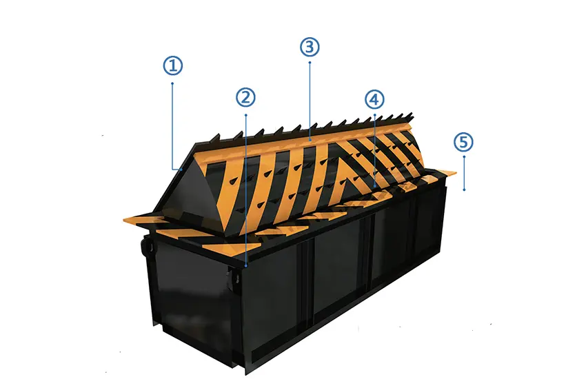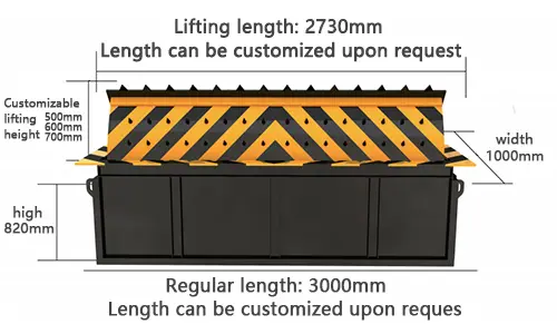 The road blocker machine is welded from A3 carbon steel and can pass 100T vehicles. The surface is sprayed with plastic effect.