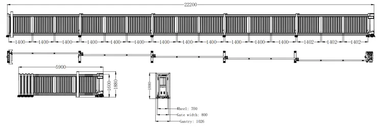 To ensure a clearance of 20.4 meters, the overall length of the gate is calculated to be 22.2 meters, the height 1.6 meters, and the width 0.8 meters. When the gate is folded down, it measures 5.9 meters. A gantry frame is used for fixing the gate.